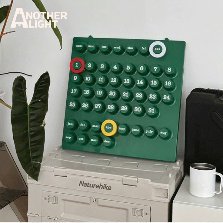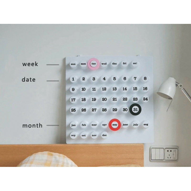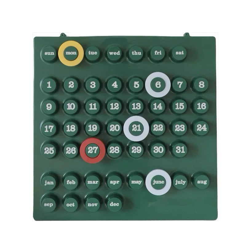 Một chiếc lịch với thiết kế tối giản và hiện đại, được làm từ chất liệu nhựa cứng cùng các màu sắc đặc trưng. Mỗi ngày, tháng và thứ trong tuần được thể hiện bằng các nút tròn nổi, cho phép người dùng dễ dàng gắn các vòng đánh dấu màu sắc (như đỏ, vàng, trắng) để chỉ định ngày, tháng và thứ cụ thể.
